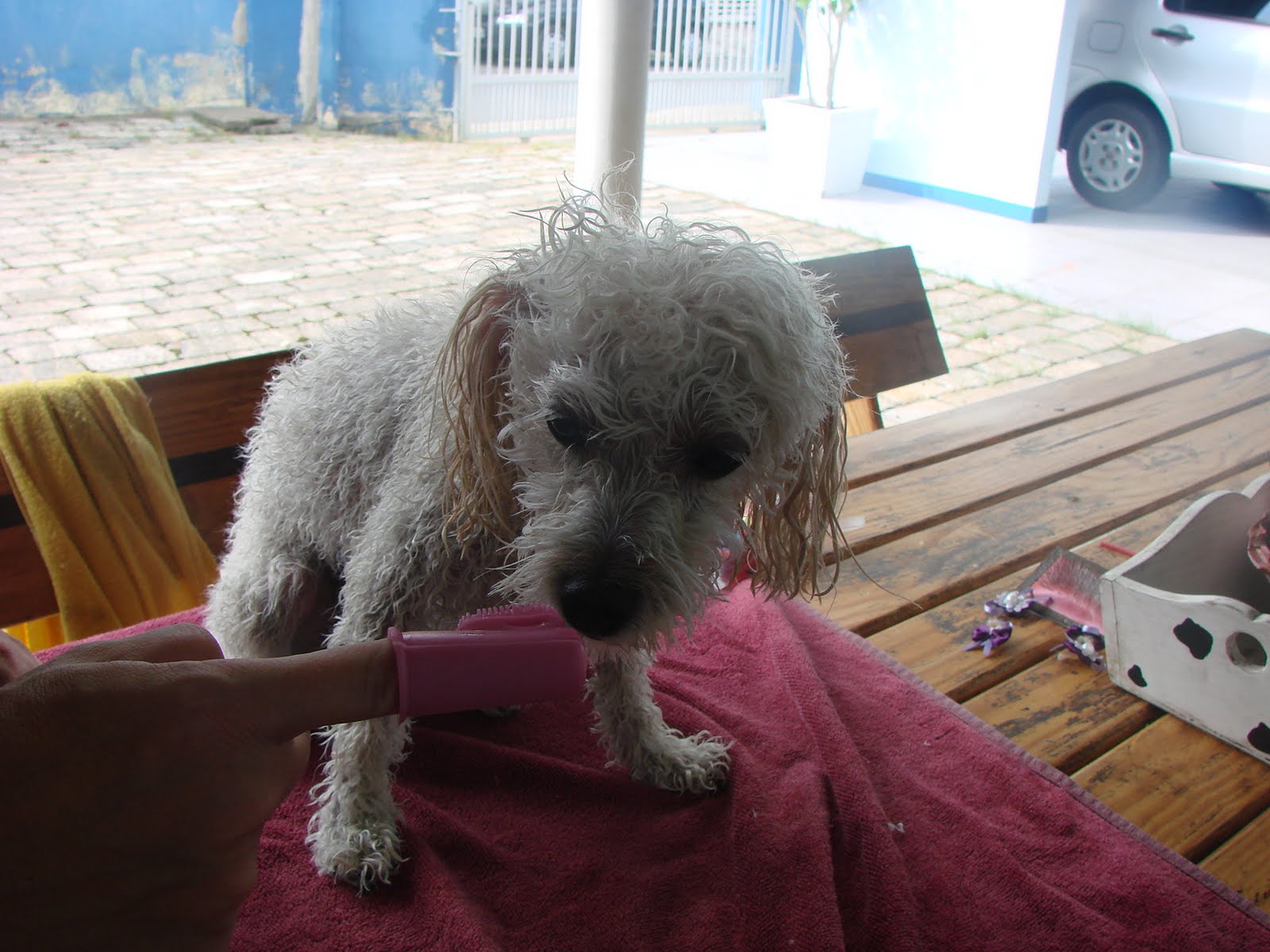 Tem dias em que nem queria sair da cama ( da mamis!).... Este foi um desses dias. Papis e Mamis resolveram fazer uma big faxina... em MIM! Primeiro Papis me levou para o chuveiro. Dá-lhe sabonete, shampoo, esfrega daqui e dali... uix... Depois lá está a mamis com cremes para pentear, secador, lacinhos, e o que eu mais DETESTO, escova e pasta de dentes... ARGH!!!!! Só fico feliz quando acaba e ganho meu ossinho!!!!!